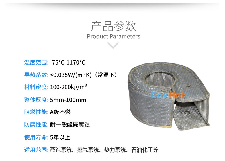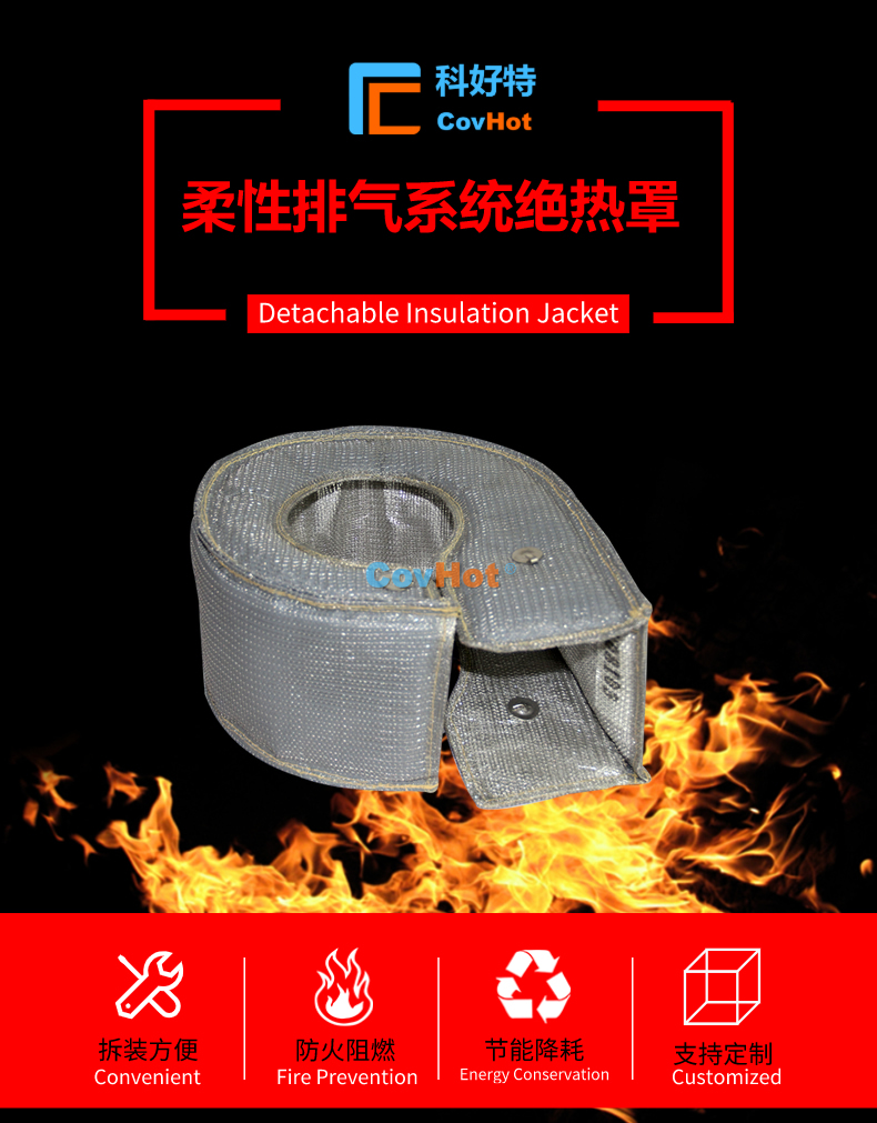 排氣管隔熱套具有易拆裝、可反復循環使用等特點,并且具有柔性,可根據排氣管的形狀,走向設計制作隔熱套,與排氣管貼合度高,包裹性強。能夠有效解決車輛排氣系統保溫隔熱難題。